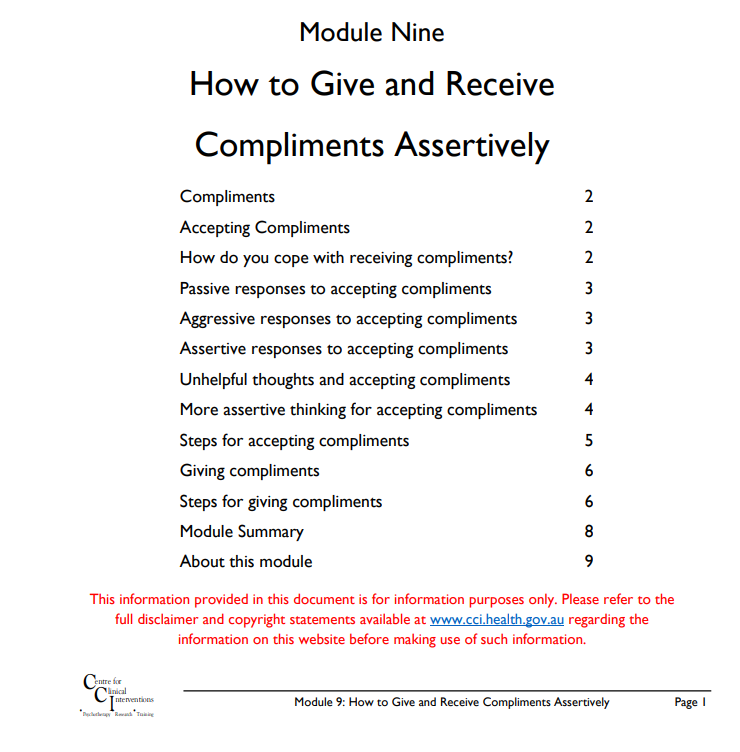 Worksheet from the Centre for Clinical Intervention in Western Australia entitled Assert Yourself: How to Give and Receive Compliments Assertively. This worksheet includes space to work through the difficulty of giving and receiving compliments. It also helps young people to develop more assertive responses by uncovering and challenging the unhelpful thoughts that make them uncomfortable with compliments.